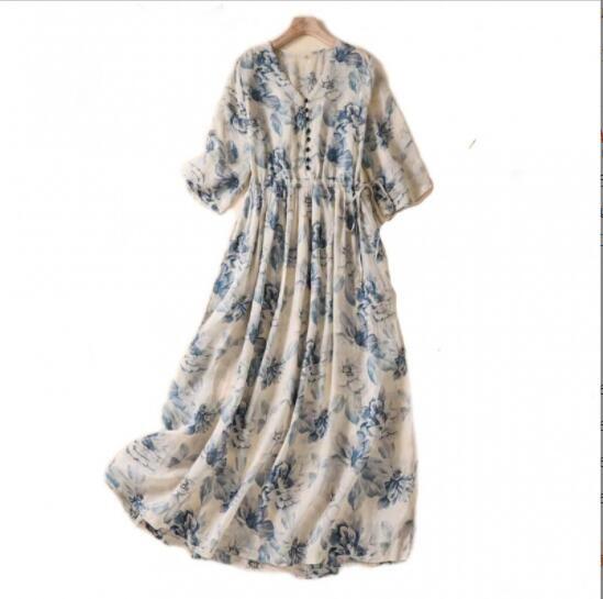 - 新品着やせ大人を素敵に見せる花柄プリント麻綿混ワンピース半袖レディースワンピース50代60代ファッションゆったりカジュアル 薄手 M通勤
