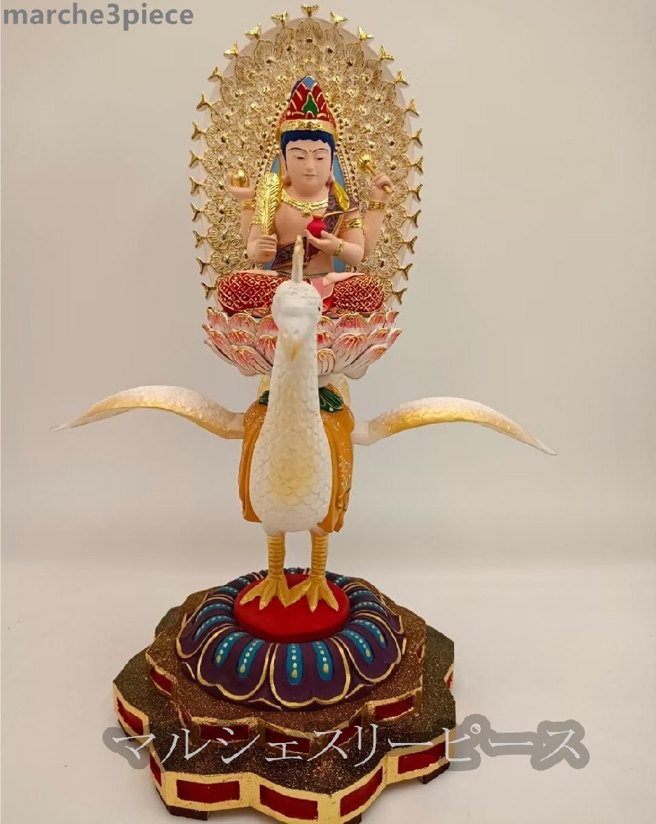 - 仏像 孔雀明王 座像 桧木彩色 乗座孔雀 高さ36.5CM