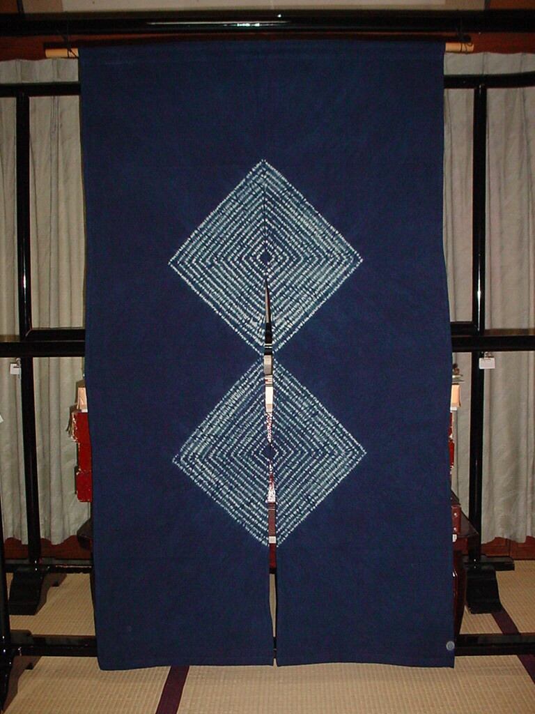 - 【 藍染のれん「 二連菱 」 藍染 絞り加工 のれん 天然染料(藍染) 綿100% インテリア用品 海外土産 (株)名古屋大森 謹製 新品 】