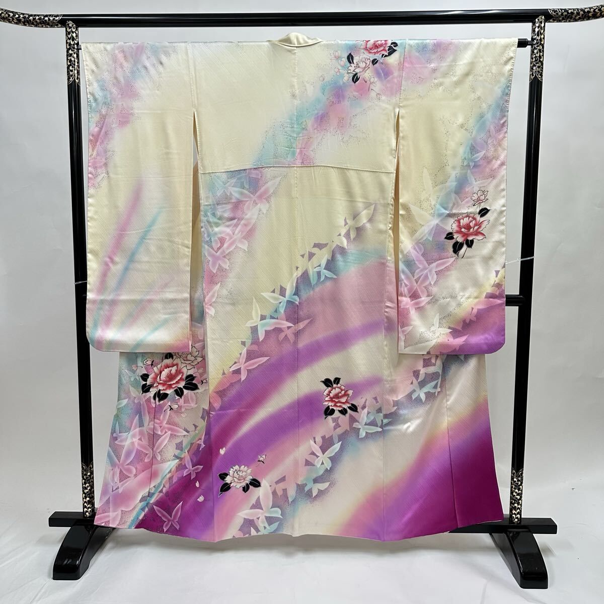 - 【七福】c振袖 古典柄 牡丹 袷 着物 成人式 着付稽古に 正絹 身丈 約156.5cm 裄 約64cm