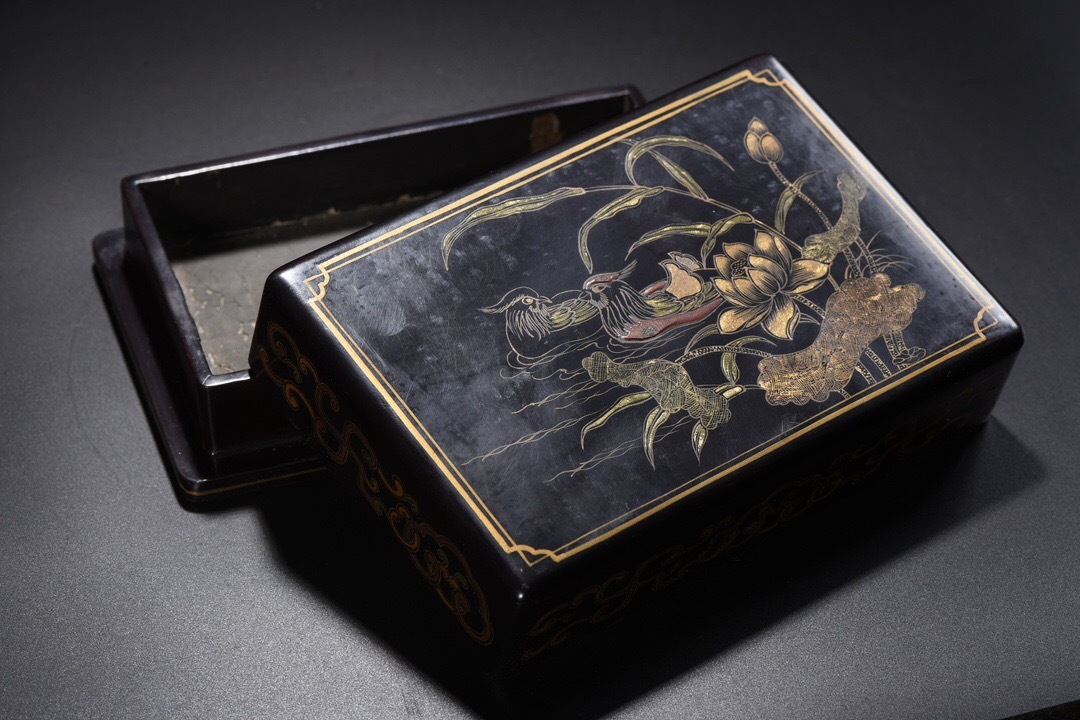 - 蔵友旧蔵出 木胎漆器彫 描真金 鴛鴦図 詩詞賦 首飾盒 供養品 置物擺件 古賞物 中国古玩 中国古美術品