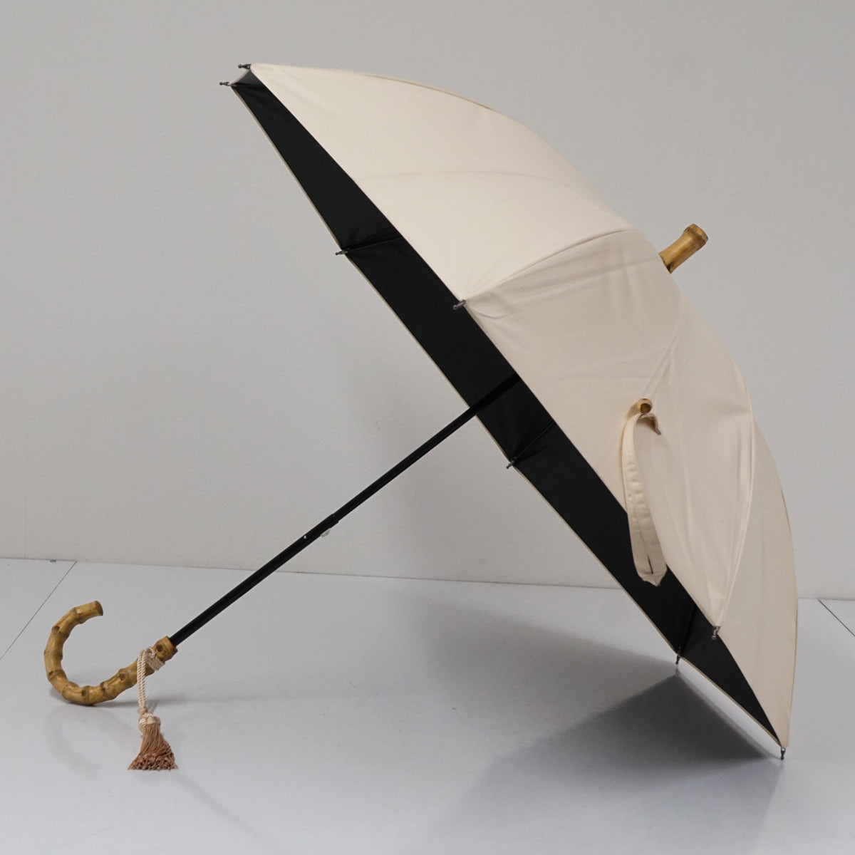 > 晴雨兼用日傘 utatane ウタタネ USED美品 一級遮光 カスタード ベージュ シンプル バンブーハンドル タッセル付 グラス骨 UV 47cm S2989
