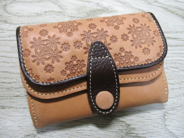 - 格安 新品 財布 レディース 三つ折り コンパクト ブランド フェランド 本革 牛革 愛らしい花の絵柄素押しデザイン キャメル
