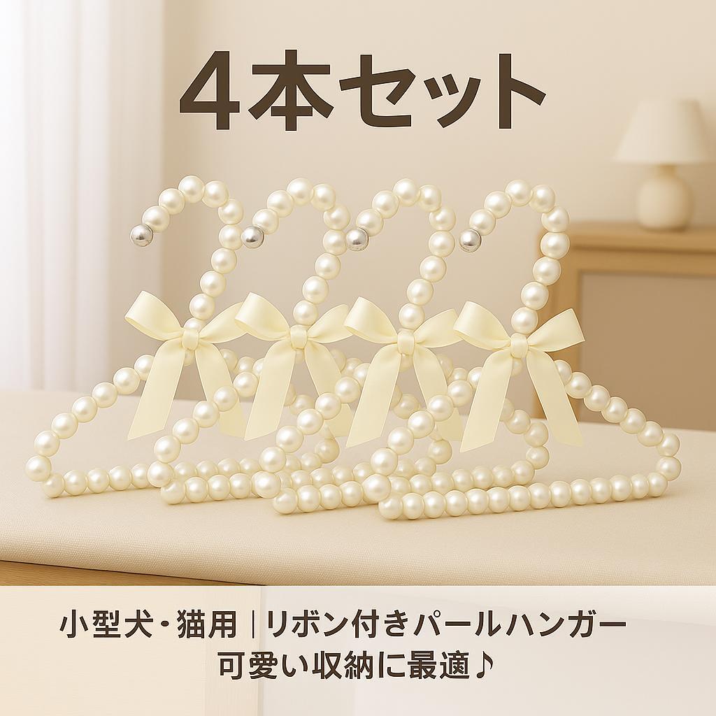 - 新品 ペット用ハンガー 4本セット ホワイト パール調 リボン付き 犬 猫 ミニサイズ かわいい