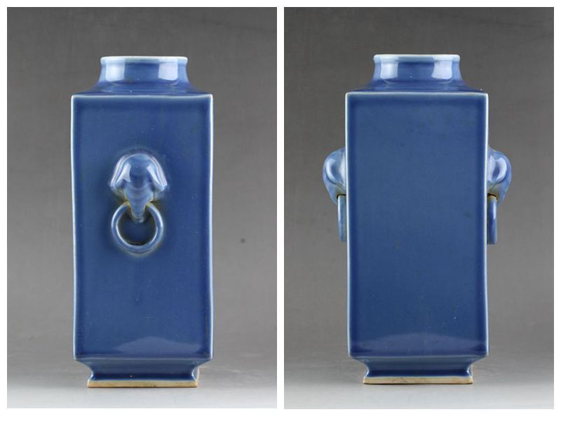 - ●唐物 大清乾隆年制款 藍釉 象耳四方瓶 花生・花器 陶磁器 骨董品●
