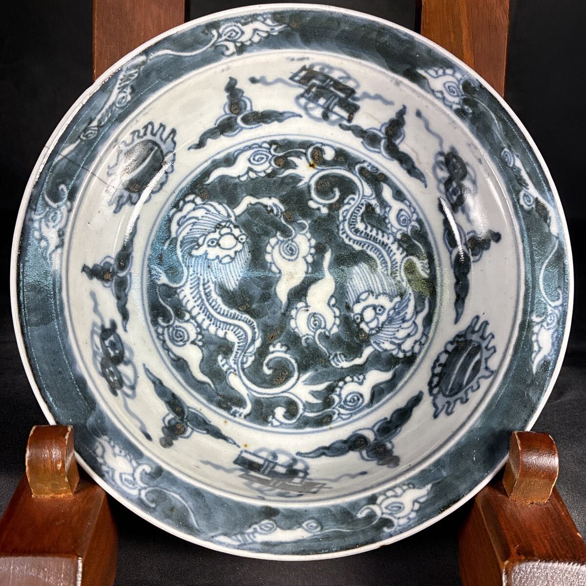 - 中国美術 双飛龍文 深小鉢 古染付 呉須 古玩 中国 中国古玩 明〜清朝期