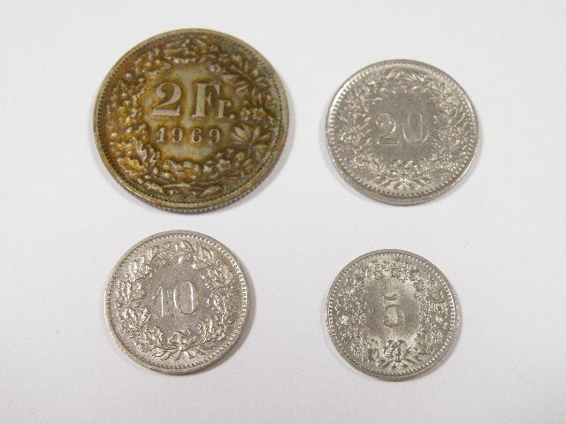 - ◎ スイス 硬貨 2フラン(1969) 20ラッペン(1966) 10ラッペン(1974) 5ラッペン(1970) 計4枚