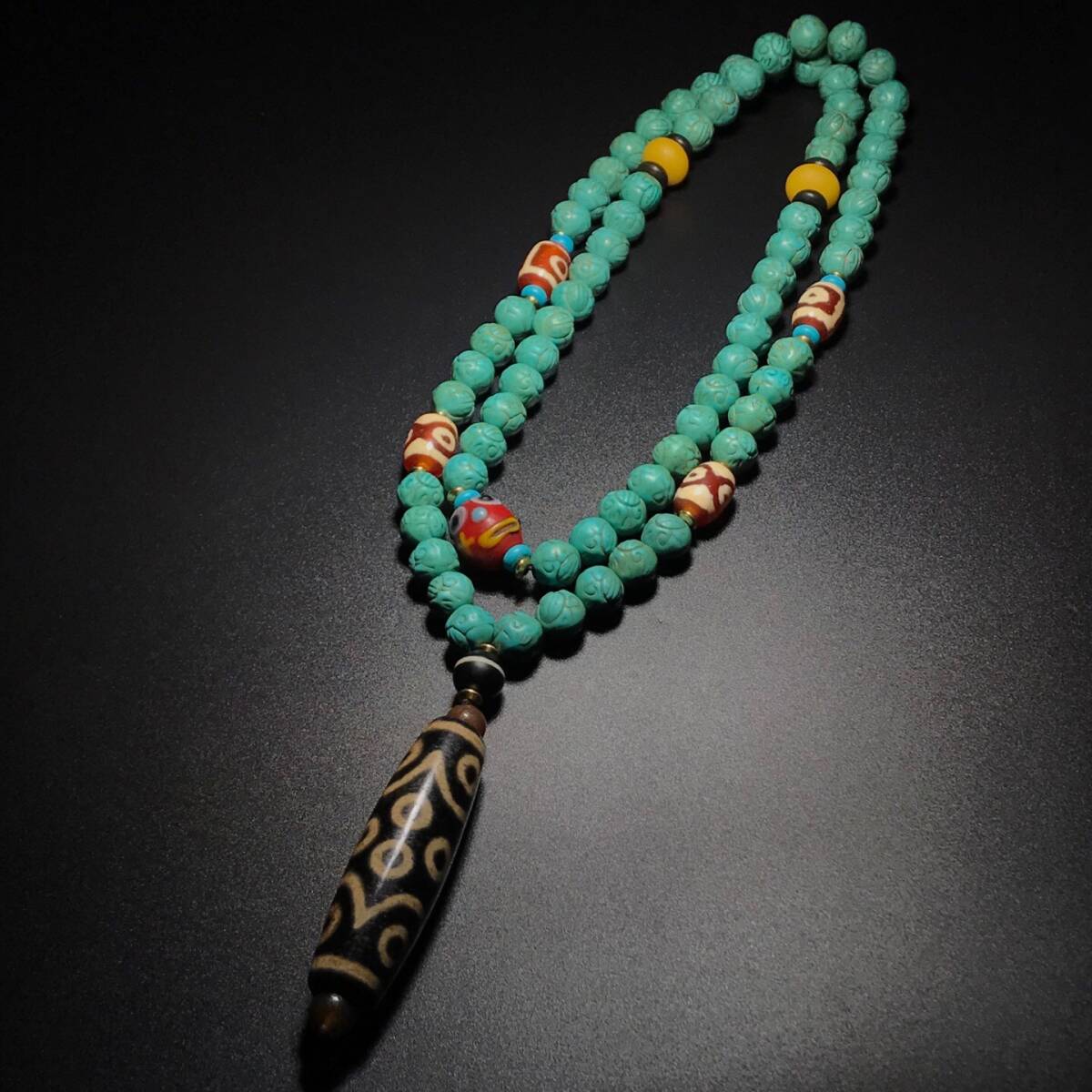 - 蔵友旧蔵出 瑪瑙製 細密彫 綠松石配十五眼天珠ネックレス本 盒付 高油包漿 根付裝身具 希少珍品 貴重品 置物 古賞物 中国古玩 中国古美術品