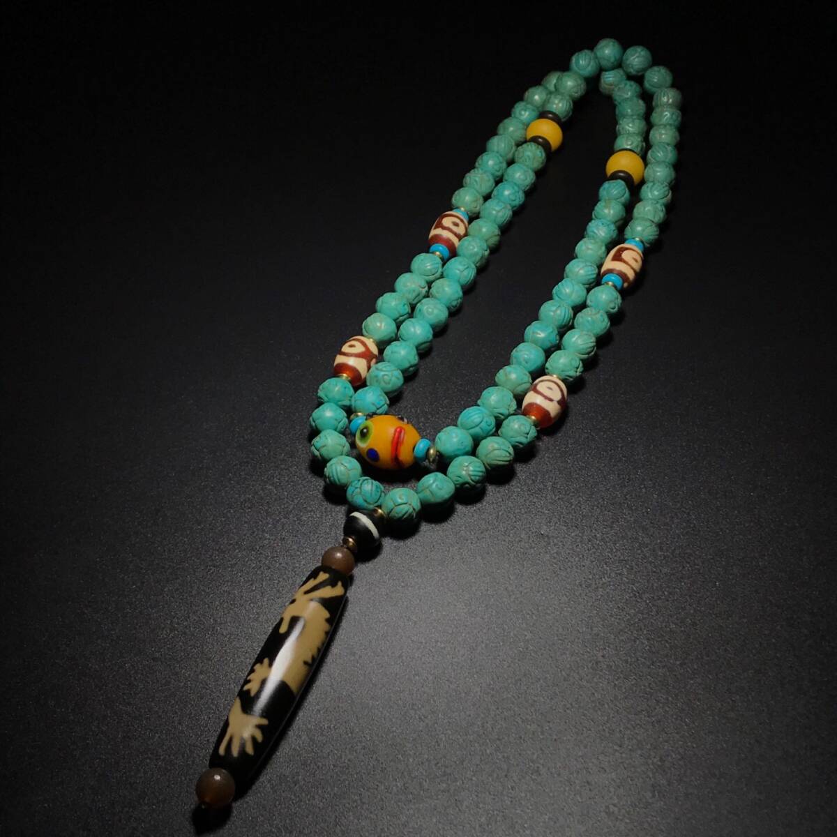 - 蔵友旧蔵出 瑪瑙製 細密彫 綠松石配五爪神龍天珠ネックレス本 高油包漿 根付裝身具 希少珍品 貴重品 置物 古賞物 中国古玩 中国古美術品