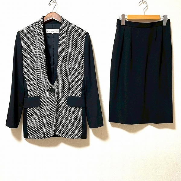 > #anc クリスチャンディオール ChristianDior スカートスーツ 11 黒 白 ヴィンテージ ノーカラー ツイード 異素材 レディース [957669]