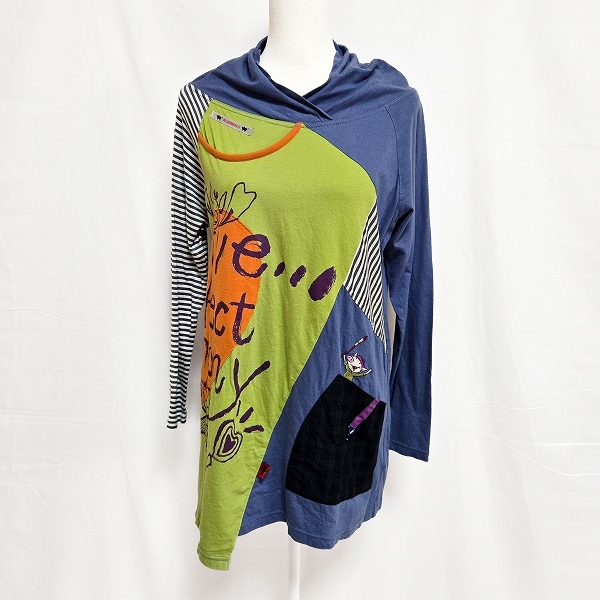 > #anc アルベロベロ ALBEROBELLO チュニック 青 黄緑 マルチ ボーダー ブタ柄 ラグランスリーブ 変形 ビジュー 刺繍 レディース [922322]