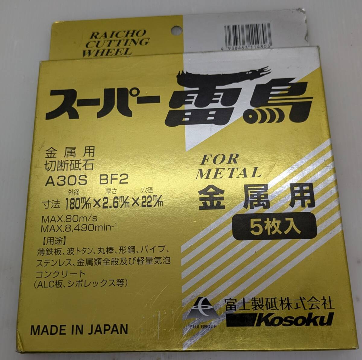 > No.933●切断砥石●未使用品●スーパ―雷鳥●金属用●180mm×2.6mm×22mm●A30S BF2●5枚セット●富士製砥