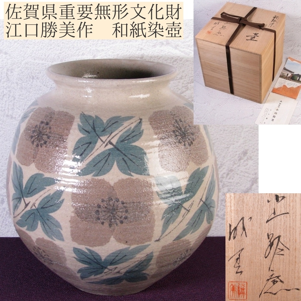 - 佐賀県重要無形文化財 江口勝美作 和紙染壺 高さ:21cm 極美品 共箱・栞付/25g054