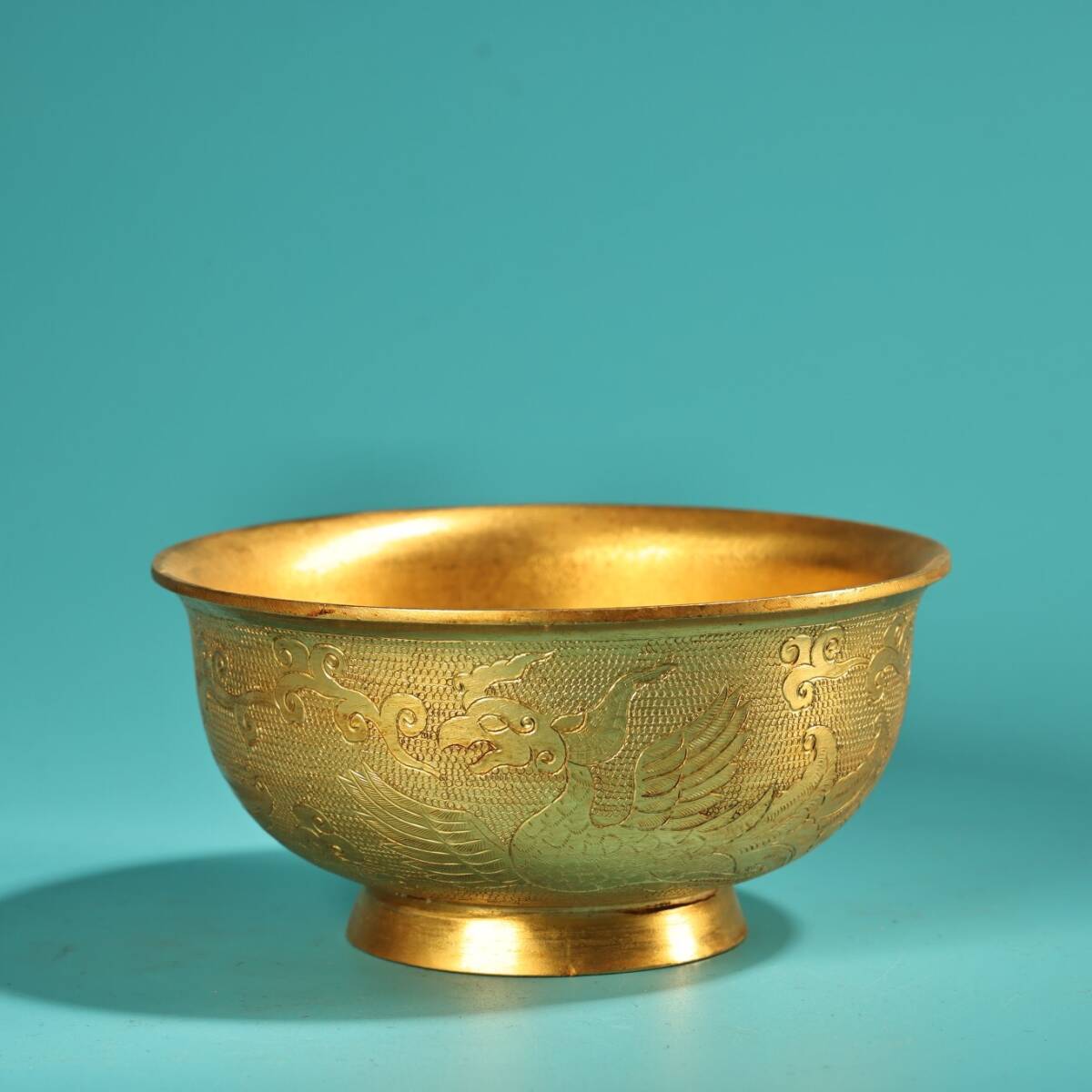 - 蔵友旧蔵出 銅製 塗金 高浮雕 鳳鳥紋 供碗 希少珍品 貴重品 置物 古賞物 密宗密教 供養品 仏教美術品