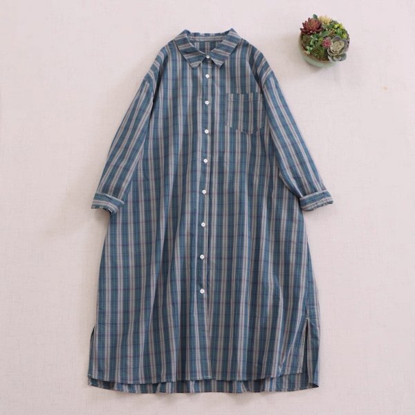 > lb 0708 カーディガンシャツワンピース Aライン フリーサイズ チュニック トップス ナチュラル 綿100% 大人可愛 チェック柄 ブルー