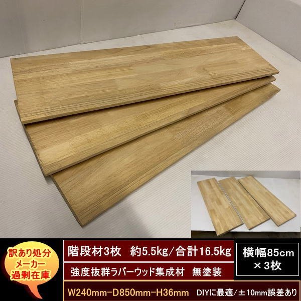 - 送料無料 訳あり処分 階段材 240-850-36mm 強度抜群 ラバーウッド集成材 3セット 合計約17kg 無塗装 DIYにお勧め!
