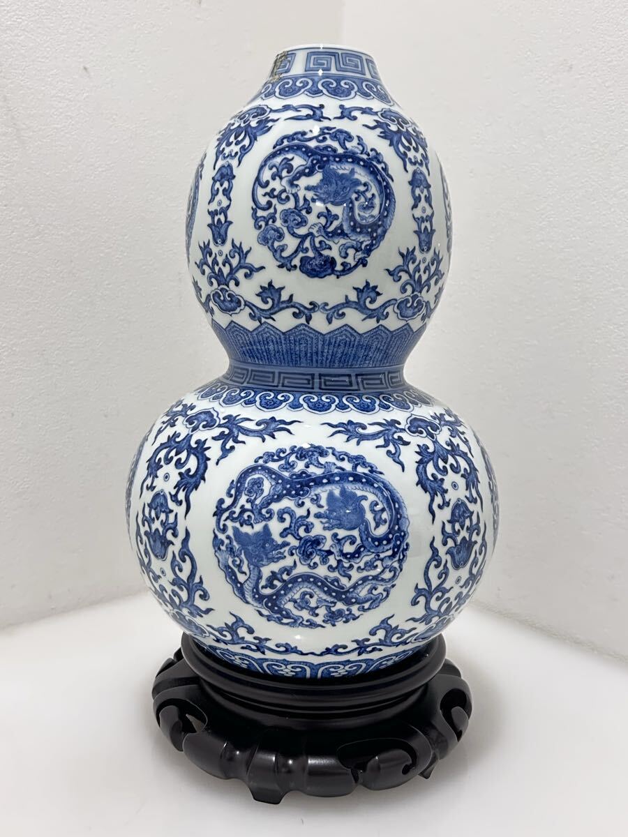 > D(0805d1) 仏教美術 染付 龍遊雲草花 花紋 瓢箪型 中国風 花瓶 花瓶 鉄瓶銀瓶 茶道具 壺 飾壺 置物 アンティーク 台座付き