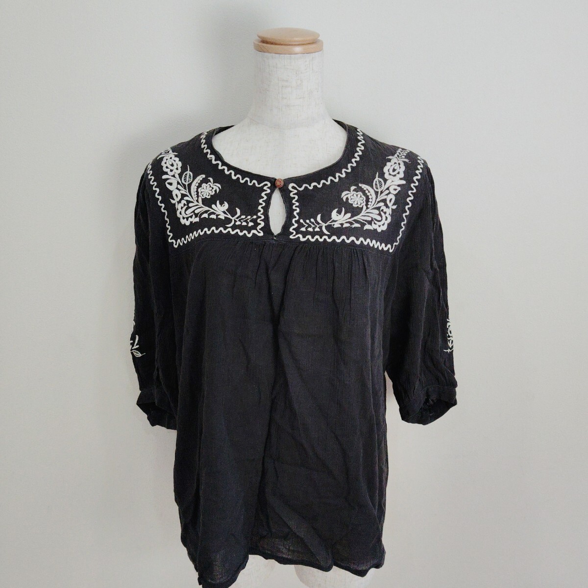 - 0805/9号/PARIENNE レディース ブラウス 七分袖 刺繍 チャコール