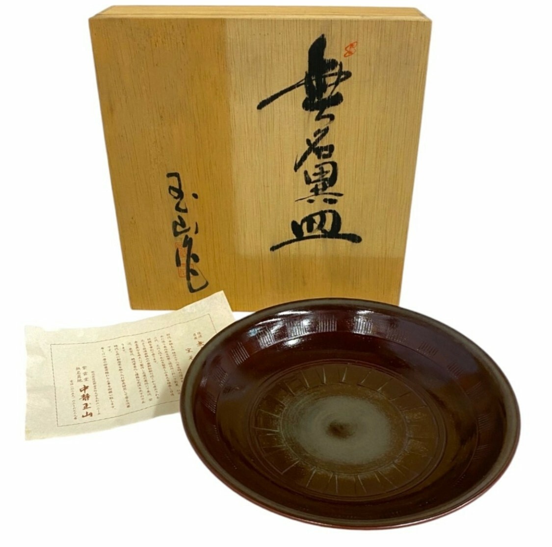 > 【新品未使用品】 佐渡名産 無名異焼 紫雲堂 中静玉山 玉山作 皿 大皿 直径約24cm 共箱付き 24む420