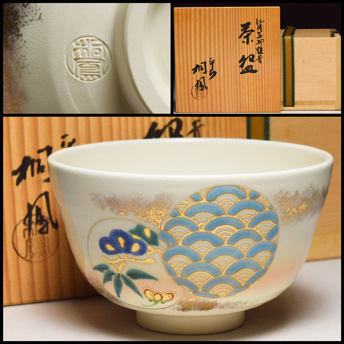 - 【八八八】平安 手塚桐鳳 仁清写 御題青 茶碗 ◆共箱 茶道具 抹茶碗 丸文 青海波 松の図 【v-021】