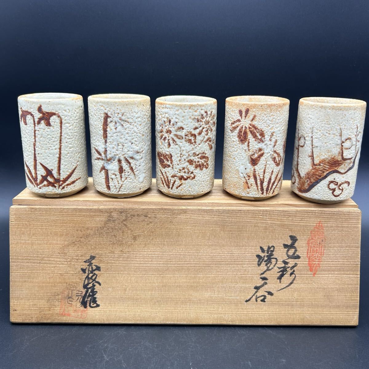 - 志野焼 五彩湯呑 草花 湯呑 湯飲み 茶器 陶器 エ16