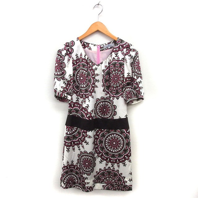 - ビアッジョブルー Viaggio Blu フレア ワンピース ひざ丈 プリント Vネック バックジップ 五分袖 1 ピンク オフホワイト /NT10 レディース