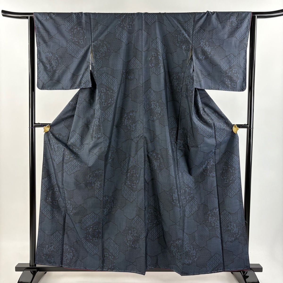 - 大島紬 身丈159.5cm 裄丈64cm M 袷 証紙 亀甲 草花 紺色 正絹 名品 【中古】
