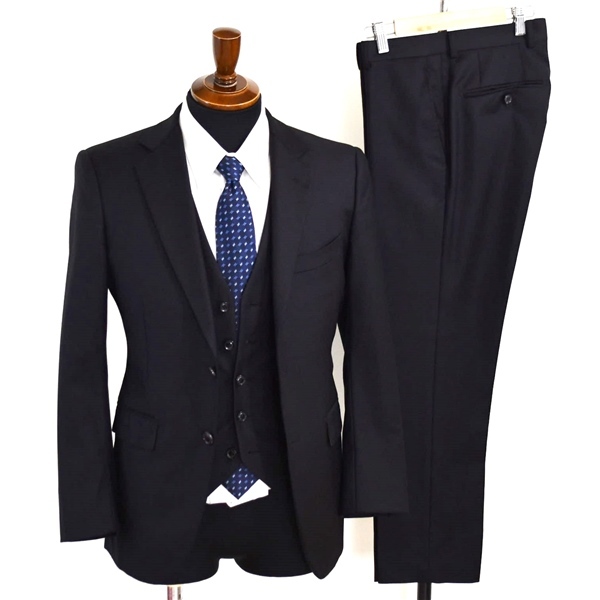 ・春秋対応。イタリア製カノニコSuper110's生地使用。3ピース 2つボタンシングル。袖口4つ釦開き見せ。総裏地仕上げ。センターベント。フラップポケット。ネーム刺繍なし(素材表記タグにネームの印字あり)。
