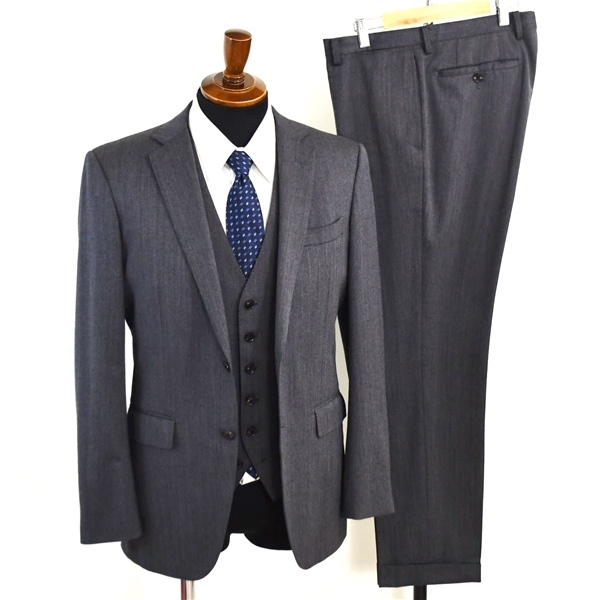 ・春秋対応。ベスト付き。2つボタンシングル。袖口4つ釦本切羽。総裏地仕上げ。センターベント。フラップポケット。ネーム刺繍なし。