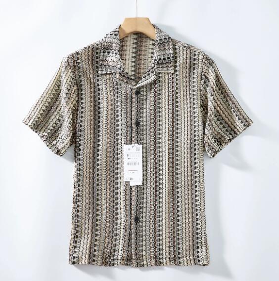 - 高品質 ジャカード メッシュ サマー ニット シャツ 半袖 メンズ 透かし編み ストライプ オープンカラー シャツ開襟 春夏 盛夏 茶色