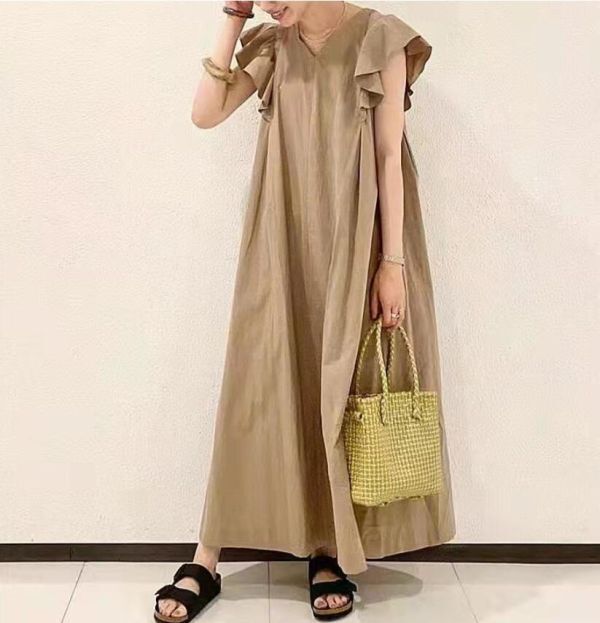 - 夏新作/ワンピース ノースリーブ きれいめ ロング レディース リネン風 体型カバー お洒落 可愛い 着痩せ 大人 ロングワンピース /カーキ