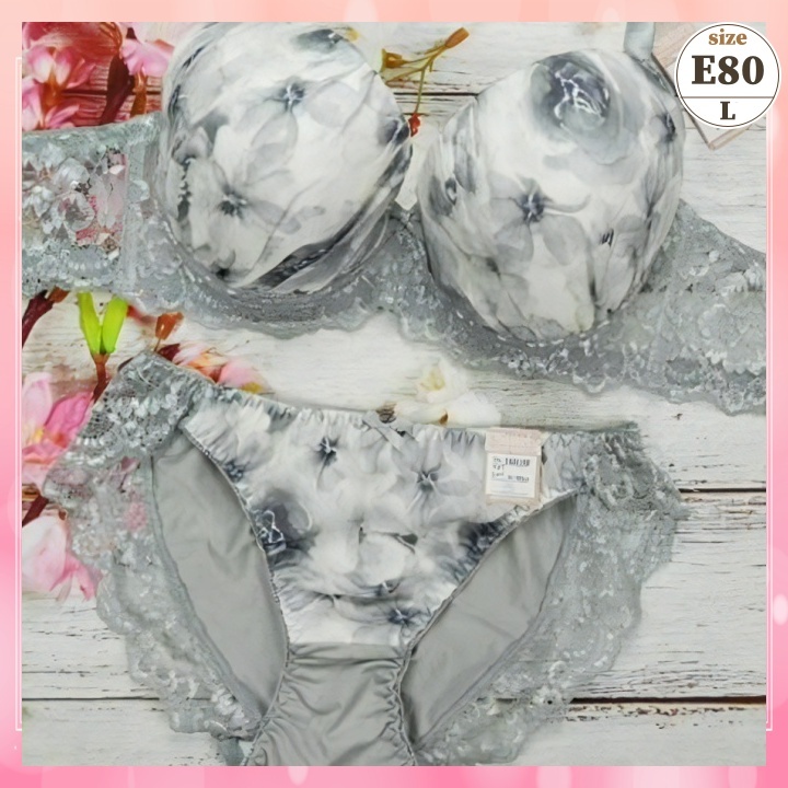 - Ze8010◎美胸ブラショーツセット【E80/L】下着 ランジェリー 脇高 谷間メイク 水中花 グレー 新品未使用
