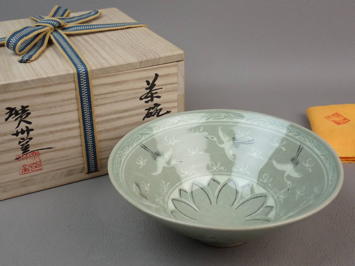 - 【骨董・茶道具】★廣州窯(趙小守)★★青磁白黒象嵌雲鶴文茶碗 gn035tb 高麗茶碗 朝鮮美術
