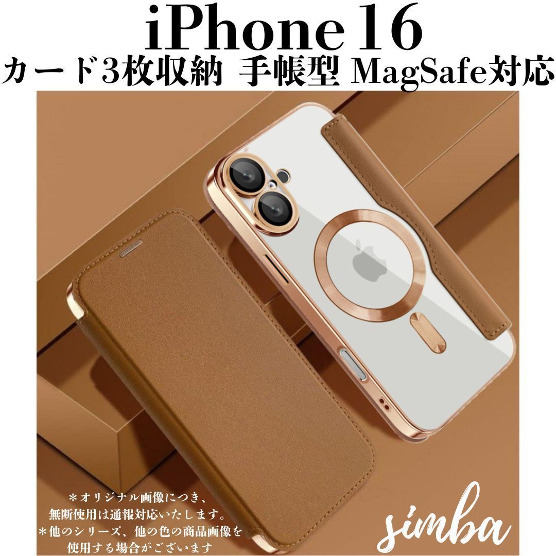 - iPhone 16 ケース 手帳型 MagSafe対応 カード収納付き 高級感あるレザー調 透明カバー 韓国風デザイン ブラウンゴールド
