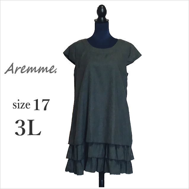 - 〔Aremme〕チャコールグレー裾ティアードワンピース 膝丈 リボン レディース ゆったりサイズ 17 3L位 ☆送料込み