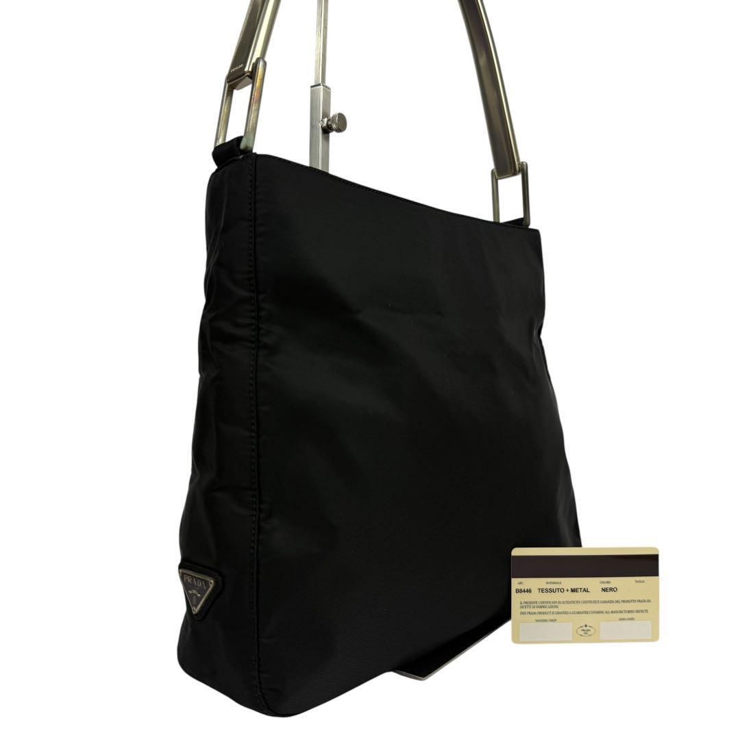 > 【美品×Gカード付き】B8446 PRADA METAL HANDLE NYLON SHOULDER BAG プラダ メタルハンドル ナイロン ワンショルダー バッグ ブラック 黒