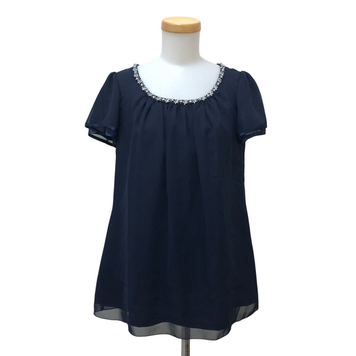 - Nm315-19 M-PREMIER エムプルミエ ビジュー 半袖 シフォン ブラウス シャツ カットソー トップス ネイビー 紺 レディース 38