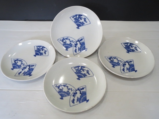 - 当時物 オールドコオラン① 香蘭社 白磁印判 扇文 陰刻ロゴマーク 6寸皿 18.6㎝ 4客 無傷