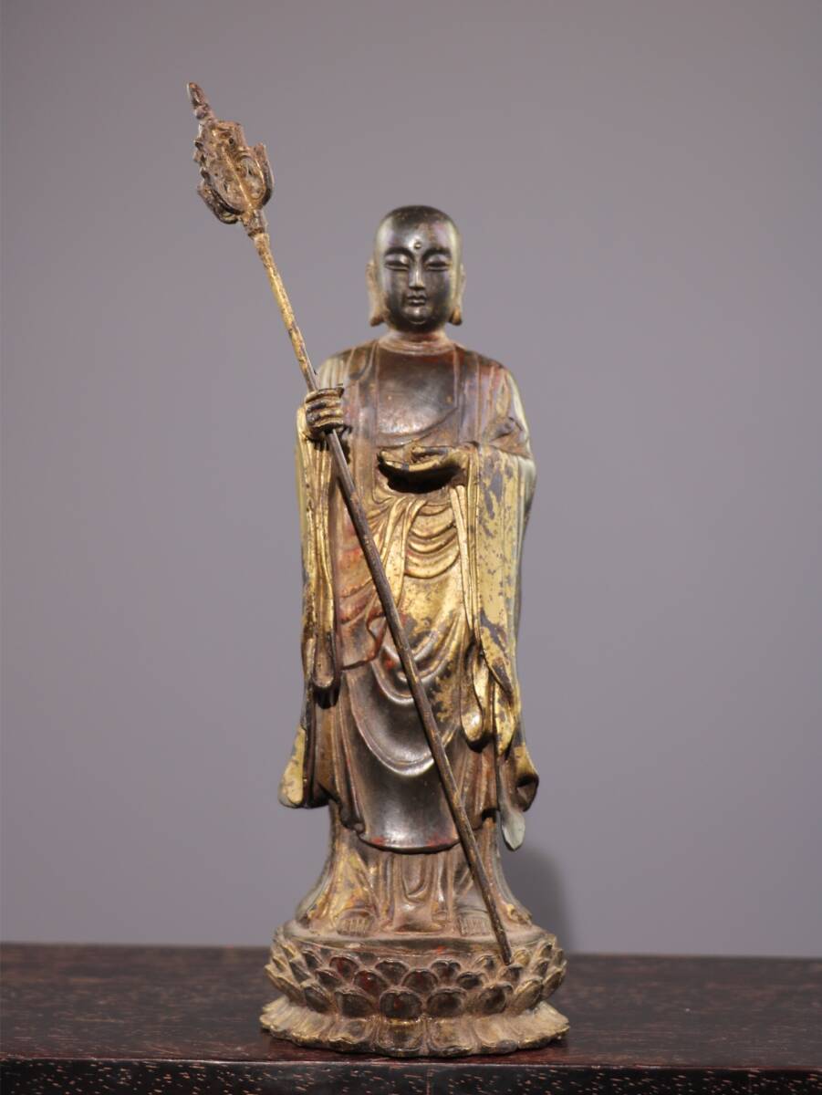 > 【超珍館蔵】銅製 泥金 朱砂 地藏王菩薩像 仏像 宗教 仏教古美術 供養品 古賞物 古董品 古美術品 時代物 旧家蔵出 稀少珍蔵品