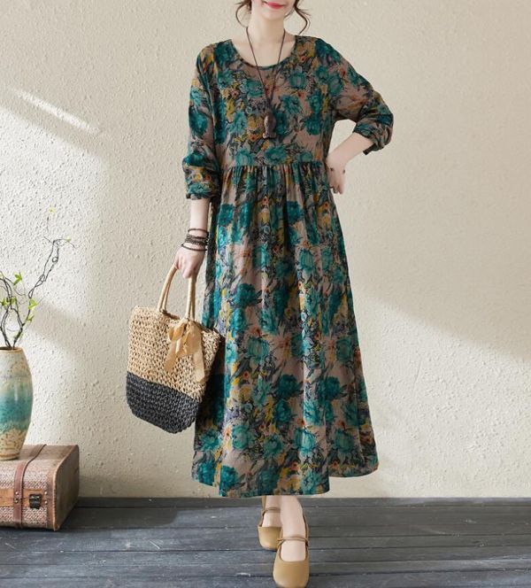 - 新品 *カジュアル 綿麻ワンピース 総柄 長袖 花柄ワンピース 大きいサイズ ロングワンピース ゆったり ロング丈 *緑