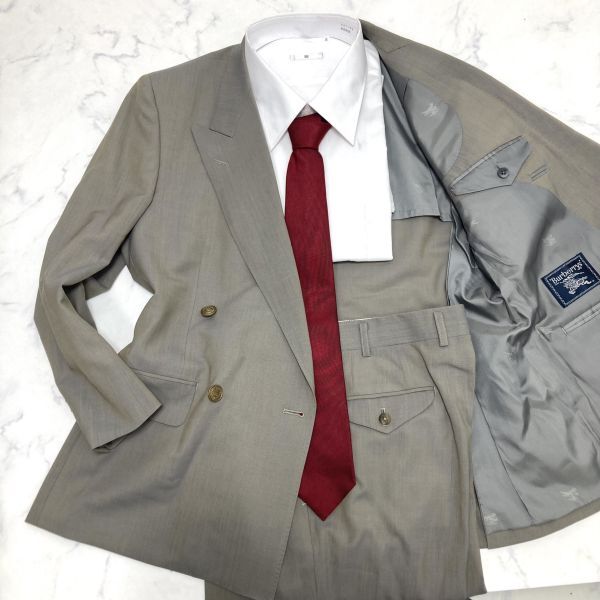 > 極美品 バーバリーズ ダブルセットアップスーツ 上下 テーラード 金ボタン ホースロゴ ウール パイピング 通年 M グレー Burberrys B1252