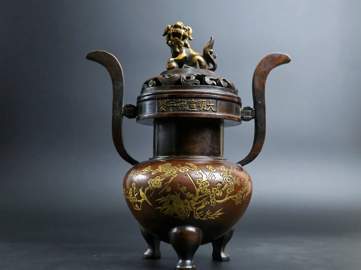 - 「明代 大明宣徳年製 古銅彫 塗金喜上眉梢 双耳老銅香薰炉」旧銅器 置物擺件 賞物 中国古美術 旧蔵出
