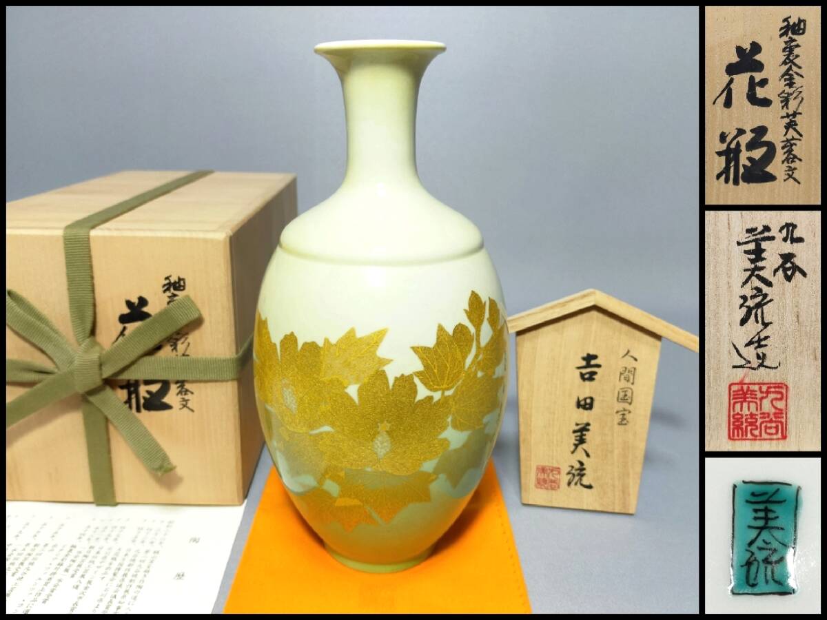 - AT09 九谷焼 花器 人間国宝 吉田美統 造 釉裏金彩芙容文 花瓶 高24.7㎝ 栞・共布・共箱 共木札 花生
