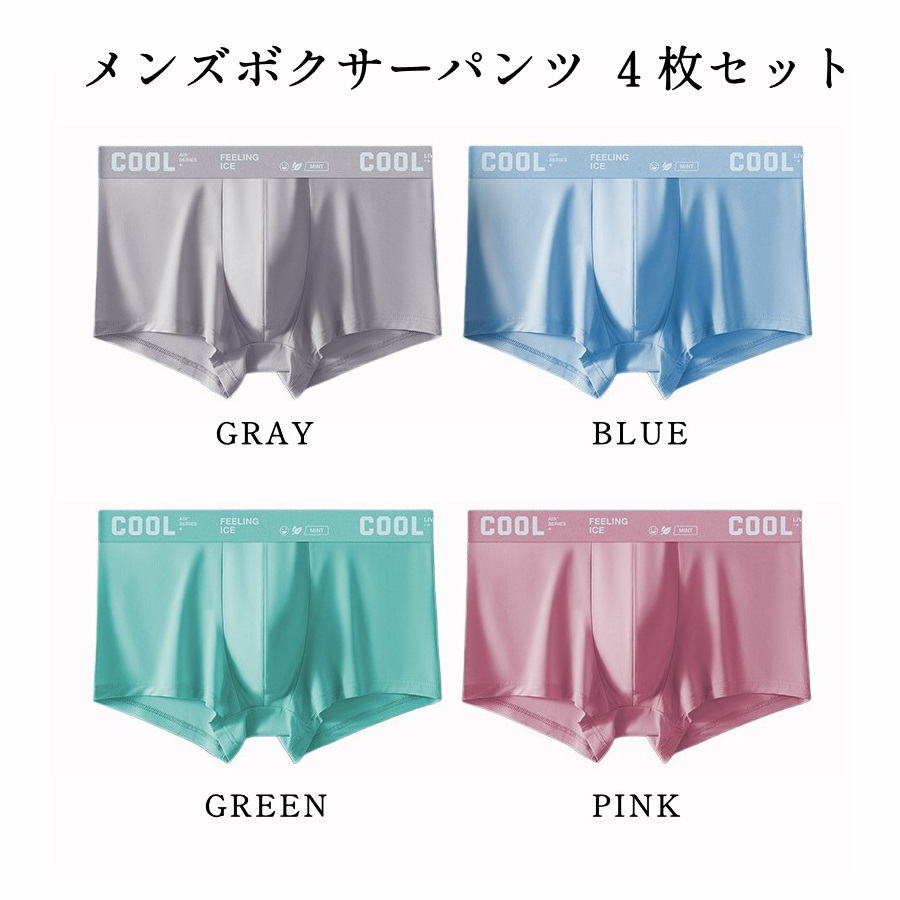 - 【COOL AIR SERIES+ 4枚組 4XL86~96cm】暑い夏に最適 4色セット★清涼感抜群COOL アイスシルク ボクサーパンツ 伸縮性・通気性・抗菌作用