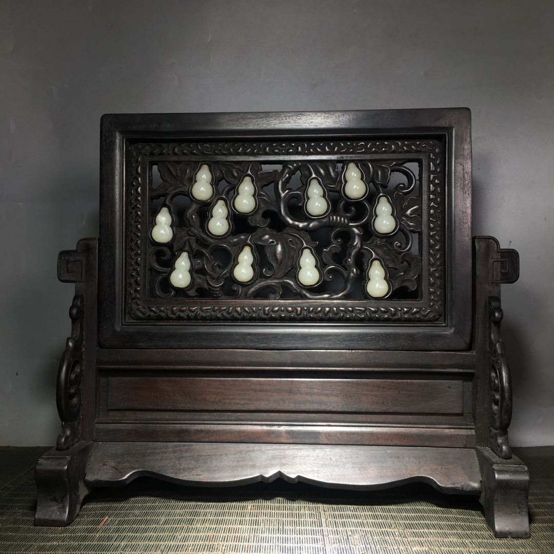 - 秘蔵 古木彫り 白檀のマンサクに玉のスクリーンをはめ込む 清代 書道具 文房具 時代物 中国古美術 細密彫 置物 賞物 唐物 木彫り 文玩 8.16