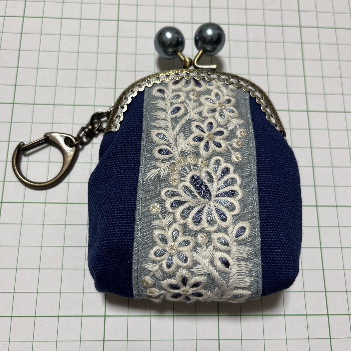 - グレーの口金がカワイイ*インド刺繍リボンを使ったがま口*キーホルダー(ナスカン)付き
