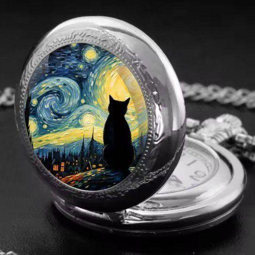- 星月夜 黒猫 デザイン 懐中時計(シルバー)