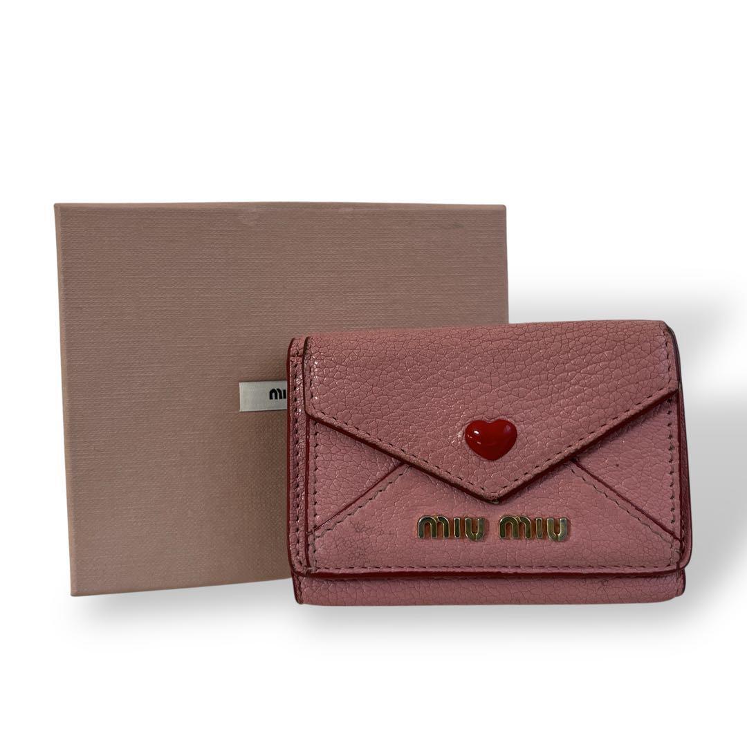 - 良品 MIUMIU ミュウミュウ マドラスラブレター 折り財布 コンパクト財布 レザー ピンク ミニ財布 メタルロゴ