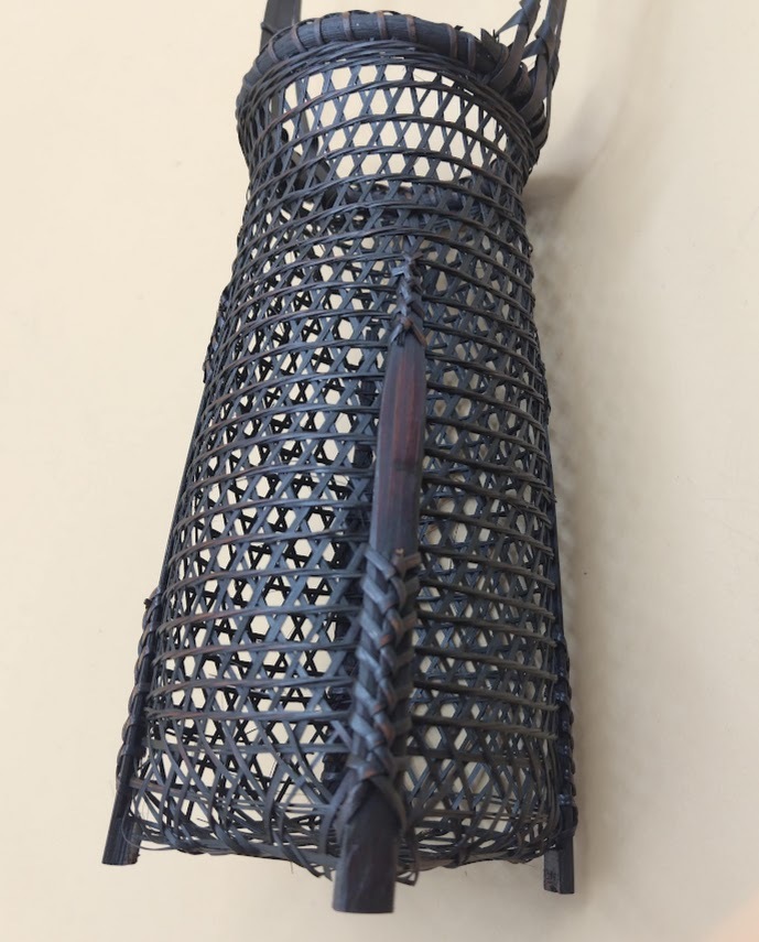 - 華道具 山科籠花入 竹製 亀甲透編 筒形花入 伝統工芸 手付
