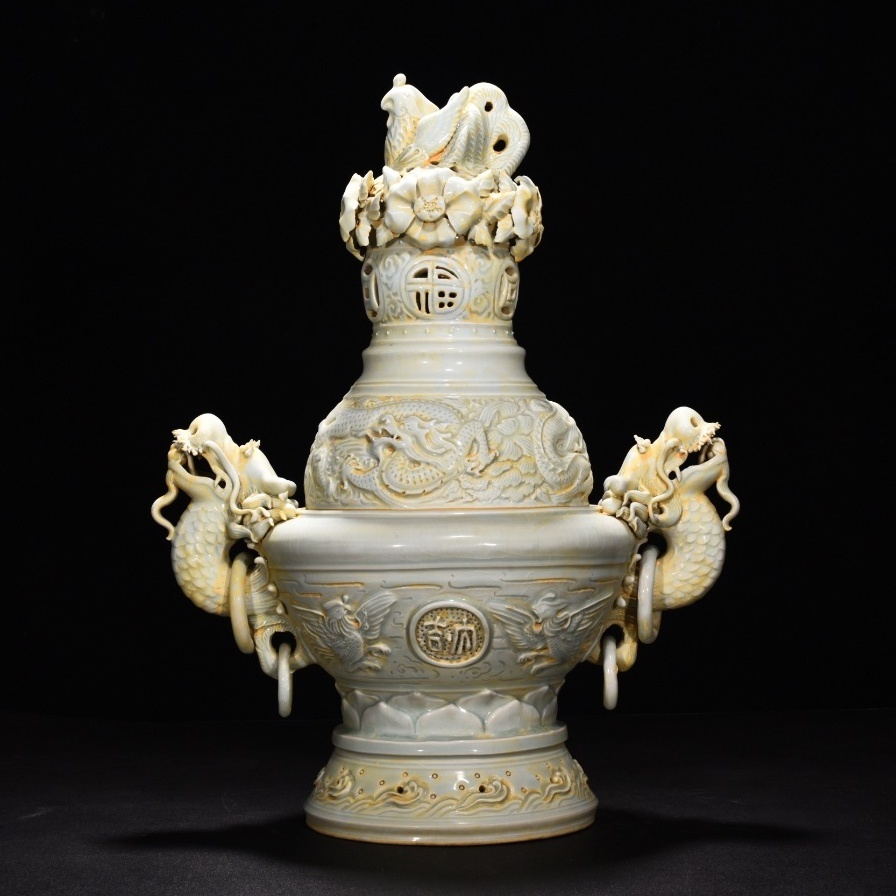 > 宋時代 湖田窯影 青白磁器 透かし彫り両耳薫香炉 高さ41.5 cm 幅31 cm 中国骨董 珍品旧蔵 古賞物 時代物 818